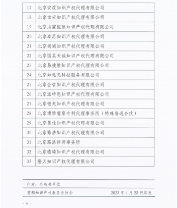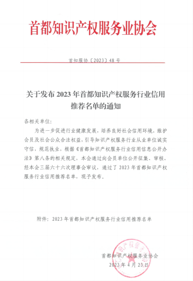 •      近(jìn)日(rì),為(wèi)促進行(xíng)業健康發展,培養良好(hǎo)社會(huì)信用(yòng)環境,維護會(huì)員(yβuán)及社會(huì)公衆合法權益,引導知(zhī)識産權服務行(xíng)業從(cóng)業≈單位誠實守信,規範執業,根據《首都(dōu)知(zhī)識産權服務行(xíng)業信用(yòng)信息公開(kāi)辦法》第八&條的(de)相(xiàng)關規定,首都(dōu)知(zhī)識産權服務業協會(huì)通(tōng)過向會(huì)員(yuán)單位公開(kāi)征集、審核,經其三屆六十六次理(lǐ)事(shì)會(huì)審議(yì)。下(xià)發了(le)《2023年(nián)首都(dōu)知(zhī)識産權服務行(xíng)業信用(yòng)推薦名單》。北京衆達德權知識産權代理有限公司西安分公司入圍該名單